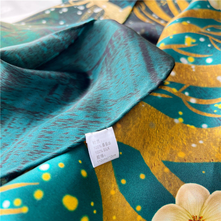 A luxurious 100% mulberry silk square scarf featuring an elegant Golden Tree floral design. Soft, lightweight, and versatile—wear it as a neck scarf, bandana, hair accessory, or bag charm. A refined everyday accessory and a beautiful gift.